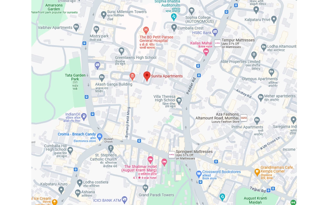 2 BHK flat for Sale in Peddar Road, Sunita Apartment, Price ₹ 3.5 Crs₹ 50000 / Sq.ft. . The 2 BHK apartment for Sale has an area of 700 Sq.ft. Built up and is located at Bomanji Petit Marg and is available in Semi Furnished condition.