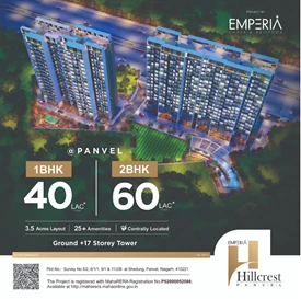 Emperia Hill Crest Project at New Panvel by Emperia Realty (P52000052086) is a RERA approved Under Construction Project with RERA ID P52000052086 slated to be ready for possession by Dec 2028 with 1/2 BHK apartments / Flats starting from ₹ 43.29 Lakh onwards