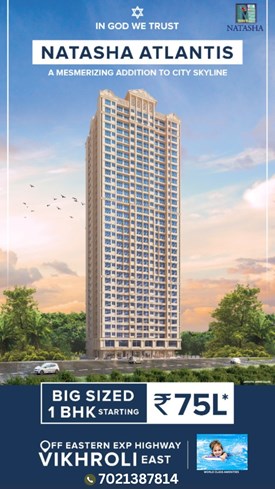 Natasha Atlantis is a Project by Natasha Developers. It is located at Vikhroli East. 10 minutes to Vikhroli Station, 20 minutes drive to BKC. Close proximity to all the daily needs and requirements. It is a G+35 storey Tower with spacious 1 and 2 BHK flats and jodi flats. Includes roof top amenities like Open Movie Theatre, infinity swimming pool and Gazebo & Star Gazing Centre, sit out area and many more.