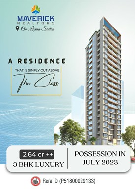 Om Laxmi Sadan is a Residential Project by Maverick Realtors. It is a 20 storey tower located at Mulund West. Connected to all the major destinations. Close proximity to the social infrastructure. It offers 2 and 3 BHK Residences, offering Lifetime green views of Sonar Bangla Garden and Olympic size swimming pool inside Kalidas sports complex. Maverick Realtors comes up with Homes to offer everything from a master washroom in every room of your home, to a Lavish balcony in the mighty Living room, which gives you a experience of endless Garden right outside. A Lavish Entrance Lobby, High speed elevators, Fitness Studio of a class next to none, Terrace Amenities for all ages from a kids zone, to a star gazing at night, from Party lawns to a dedicated Senior citizens area while we ensure, they reach in our elevators at the right time at the terrace. RERA approved project.
